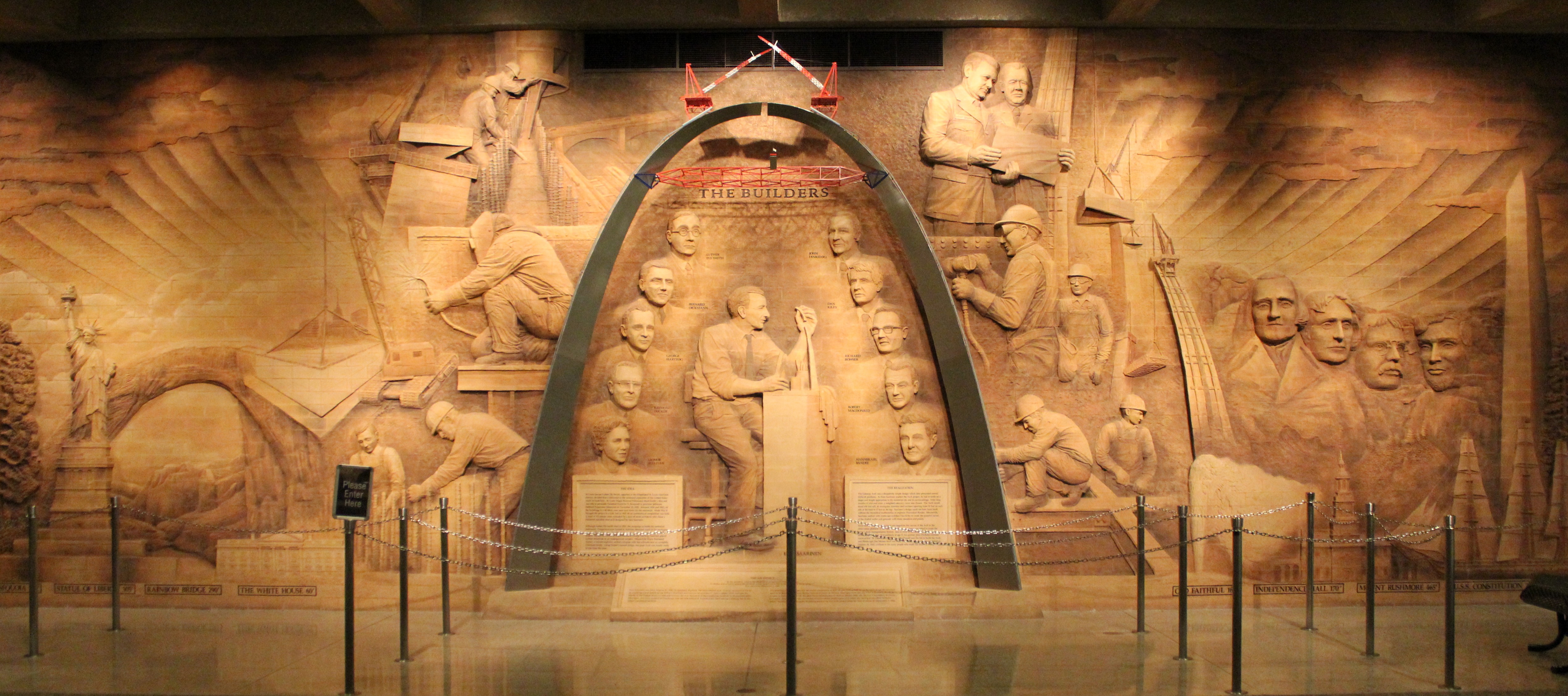 As you can see from the mural the Arch is actually bigger then the Statue of Liberty, the Washington monument, Mount Rushmore and the Delicate Arch at the Arches National Park in Utah. It’s also bigger then the Eiffel Tower and the Seattle Space Needle. And yes it was designed by a man, how did you guess?
