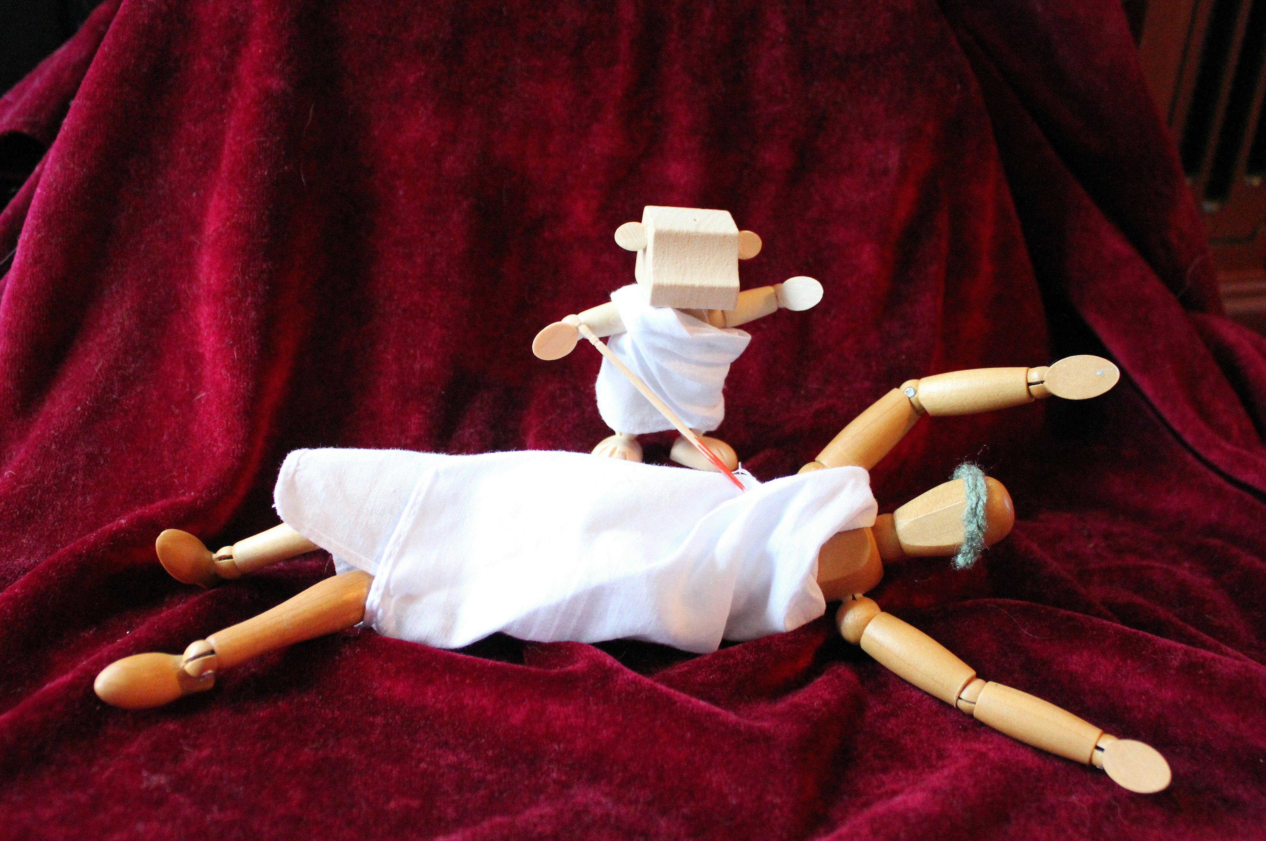 Since Dummy doesn’t have any cookies, he went the Shakespearean route. I can’t figure out if he’s King Lear, Richard, Henry V or what. He seems to have Caesar’s die which doesn’t bode well for a peaceful day. I had better go make him cookies before he pouts himself right off the stage. He is such a diva. He even stole my little harlequin doll’s pants so he couldn’t make an appearance. I think I’ll heckle him first..